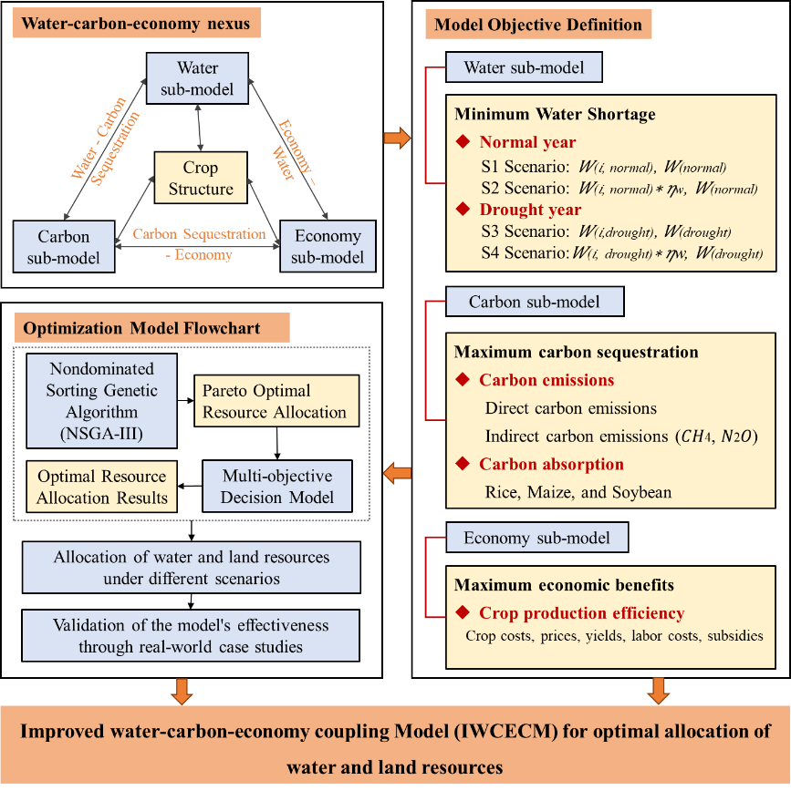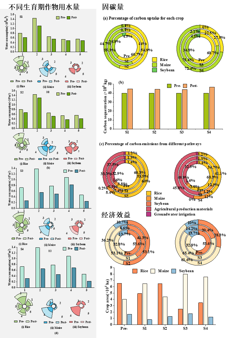 本研究突破了以往水資源分配中對(duì)作物需水過程過度概化的問題,并對(duì)我們之前研發(fā)的WCECM模型進(jìn)行了改進(jìn)。研究從作物灌溉用水、種植結(jié)構(gòu)、固碳量、經(jīng)濟(jì)效益和產(chǎn)量等多個(gè)角度進(jìn)行了深入分析。基于作物需水過程,提出了不同水文情景下的作物種植結(jié)構(gòu)和水資源優(yōu)化配置方案。通過 NSGA-III 算法選擇最優(yōu)解,并提出有針對(duì)性的優(yōu)化策略。最后將改進(jìn)的水-碳-經(jīng)濟(jì)耦合模型(IWCECM)在中國(guó)具有代表性的農(nóng)業(yè)主產(chǎn)區(qū)——三江平原友誼農(nóng)場(chǎng)進(jìn)行應(yīng)用和驗(yàn)證。結(jié)果表明,改進(jìn)后的模型不僅能夠根據(jù)不同情景精確調(diào)整作物種植結(jié)構(gòu),管理每種作物在不同生長(zhǎng)階段的灌溉用水需求,還能提高固碳量、經(jīng)濟(jì)收入和糧食產(chǎn)量。具體而言,優(yōu)化后,平水年常規(guī)灌溉模式 (S1) 和節(jié)水灌溉模式 (S2)以及干旱年份的常規(guī)灌溉模式 (S3) 和節(jié)水灌溉模式 (S4)下的種植面積比例分別為4:5:1、5:4:1、2:7:1和3:6:1。與優(yōu)化前相比,四種方案的總固碳量分別增加了4.95×108 kg、4.56×108 kg、4.04×108 kg和6.84×108 kg,糧食總產(chǎn)量分別增加了1.72×108 kg、1.43×108 kg、0.69×108 kg和1.45×108 kg。除枯水年外,其他方案下的經(jīng)濟(jì)效益與優(yōu)化前無明顯差異。在平水年,作物在生長(zhǎng)初期的總用水量最高;在枯水年,作物在生長(zhǎng)中期的總用水量最高。該結(jié)果不僅對(duì)解決當(dāng)前農(nóng)業(yè)水資源和土地資源的相關(guān)挑戰(zhàn)具有現(xiàn)實(shí)意義,也為未來農(nóng)業(yè)的可持續(xù)發(fā)展提供了參考和建議。