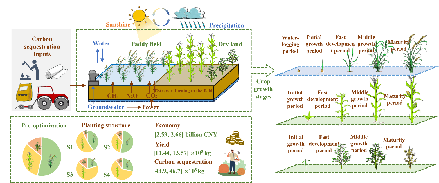 農(nóng)業(yè)灌溉占用全球取用水總量的70%以上。在國(guó)家“四水四定”的戰(zhàn)略背景下,解決水土資源時(shí)空不匹配的問題對(duì)保障我國(guó)糧食安全至關(guān)重要。水土資源之間聯(lián)系錯(cuò)綜復(fù)雜,任何一種資源的短缺都會(huì)限制另一種資源的利用,從而降低水土資源的綜合利用效率。在開展農(nóng)業(yè)水土資源優(yōu)化配置研究時(shí),如何協(xié)調(diào)二者之間關(guān)系是亟需解決的關(guān)鍵科學(xué)問題。然而,由于極端氣候頻率不斷增加和下墊面條件復(fù)雜性加劇,水資源年際間和年內(nèi)變異系數(shù)顯著增強(qiáng),充分滿足農(nóng)作物生長(zhǎng)過程的水資源可持續(xù)供給面臨著巨大的挑戰(zhàn)。特別是在干旱時(shí)期,降水量的減少使得可供作物生長(zhǎng)的有效降水量大幅下降,從而加劇了農(nóng)業(yè)生產(chǎn)用水的壓力。同時(shí),農(nóng)業(yè)生產(chǎn)過程中過量施用化肥、農(nóng)藥和農(nóng)業(yè)機(jī)械會(huì)導(dǎo)致大量碳排放,對(duì)生態(tài)系統(tǒng)的穩(wěn)定構(gòu)成威脅。因此,從水-碳-糧食耦合視角開展基于作物需水過程的農(nóng)業(yè)水土資源優(yōu)化配置研究對(duì)保障我國(guó)糧食安全具有重要意義。