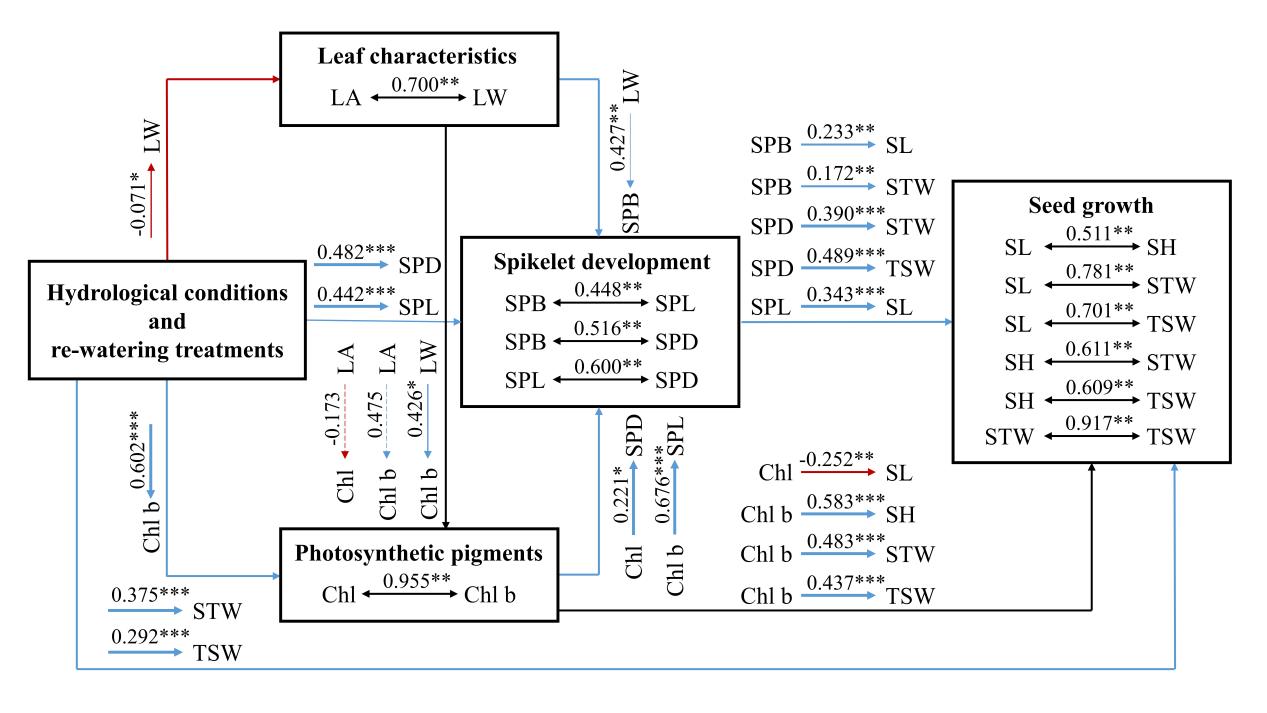 研究結(jié)果表明,初始水文條件和分時補(bǔ)水措施顯著影響了瘤囊薹草的小穗發(fā)育、種子生長、葉片發(fā)育以及光合色素積累。相較于其他處理,濕潤條件結(jié)合第15天補(bǔ)水至初始水文狀態(tài)的水文情勢顯著增強(qiáng)了瘤囊薹草小穗發(fā)育特征、種子生長特性,且葉片生態(tài)特征及葉綠素含量均高于其他處理條件。此外,小穗發(fā)育特征和種子生長性狀與葉片生態(tài)特征和葉綠素含量表現(xiàn)出顯著的相關(guān)性。在驅(qū)動機(jī)制方面,水文條件及補(bǔ)水情境直接影響了瘤囊薹草的小穗發(fā)育和種子生長,同時還通過調(diào)控葉片寬度和葉綠素b含量從而間接影響小穗發(fā)育過程和隨后的種子生長活動。總體而言,精準(zhǔn)補(bǔ)水措施通過多種途徑顯著影響瘤囊薹草的小穗發(fā)育和種子生長。結(jié)合半干旱區(qū)氣候特征及農(nóng)業(yè)發(fā)展?fàn)顩r,實施洪水和融雪水資源集約化利用以及農(nóng)業(yè)-生態(tài)水資源共管可作為半干旱地區(qū)高效利用水資源的關(guān)鍵策略。