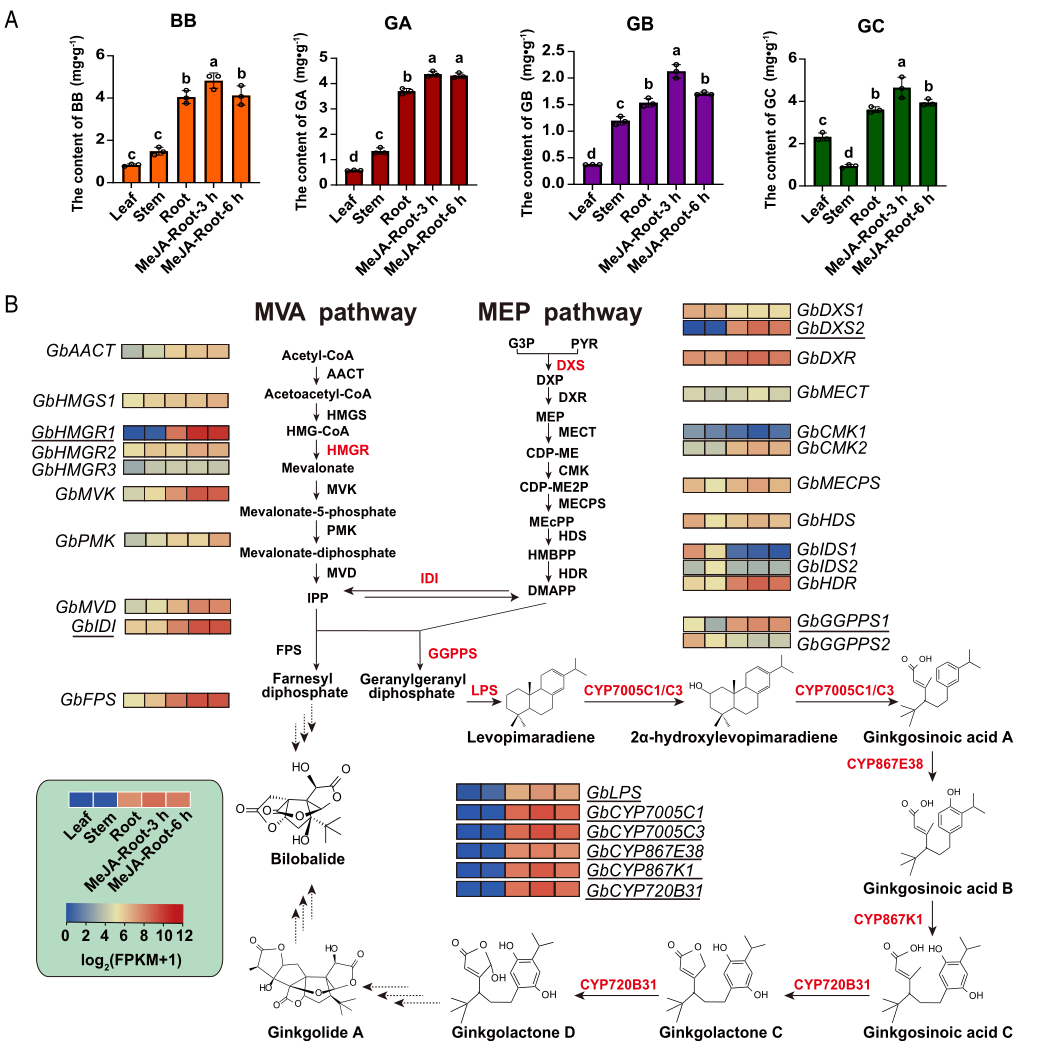 圖1. 銀杏中不同組織部位(葉、莖、根)銀杏內酯的含量及MeJA處理下比較轉錄組分析