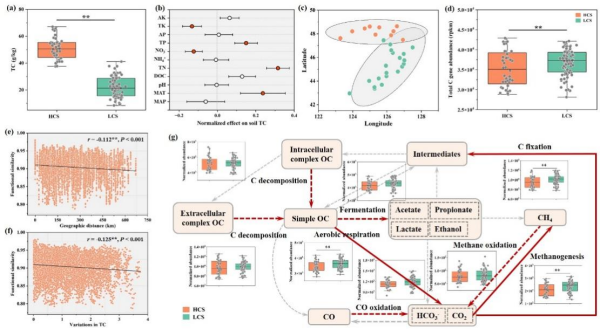 東北地理所農(nóng)田分子生態(tài)學(xué)科組研究人員針對(duì)東北典型黑土帶120個(gè)水稻土樣品,利用宏基因組測(cè)序技術(shù),探究碳代謝微生物地理分布格局及其功能調(diào)控特征。研究表明,微生物碳功能與基因組分類(lèi)水平均呈現(xiàn)顯著的距離衰減關(guān)系(DDRs)。微生物碳代謝特征可聚類(lèi)為兩組:HCS代表高緯度地區(qū)總碳(TC)含量較高的土壤,而LCS為低緯度地區(qū)碳含量較低的土壤。與HCS相比,LCS中涉及有氧呼吸、碳固定和甲烷生成的碳循環(huán)途徑豐度更高,且碳水化合物酯酶(CE)和糖基轉(zhuǎn)移酶(GT)類(lèi)活性更強(qiáng),說(shuō)明含碳量較低的黑土中微生物碳代謝能力更強(qiáng)(圖1)。