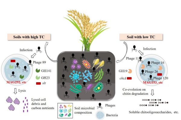 利用基因組組裝技術(shù)構(gòu)建了211個(gè)具有多樣碳代謝功能基因組(MAGs),其中高質(zhì)量MAG292豐度(歸屬于Nanopelagicales目)與TC呈顯著正相關(guān);而MAG153(歸屬于Chitinophagales目)則呈現(xiàn)相反趨勢(shì)。進(jìn)一步構(gòu)建了133個(gè)新型病毒基因組(vMAGs),其中phage11、phage16、phage26和phage120在LCS中豐度較高,這些病毒攜帶參與幾丁質(zhì)降解的chiA和GH19基因;而phage89在HCS中豐度較高,其攜帶調(diào)控肽聚糖裂解的slt和GH23基因。綜合以上結(jié)果,在東北黑土帶的高緯度地區(qū),土壤病毒可能通過(guò)編碼肽聚糖裂解酶裂解細(xì)菌,釋放養(yǎng)分并增加死亡微生物殘?bào)w,從而促進(jìn)土壤碳積累;而在低緯度地區(qū),病毒與微生物可能通過(guò)表達(dá)參與幾丁質(zhì)降解的輔助代謝基因(AMGs)間接降低了土壤總碳含量(圖2)。本研究揭示了中國(guó)黑土區(qū)水稻土微生物對(duì)土壤碳異質(zhì)性的差異化適應(yīng)進(jìn)化與碳調(diào)控策略。