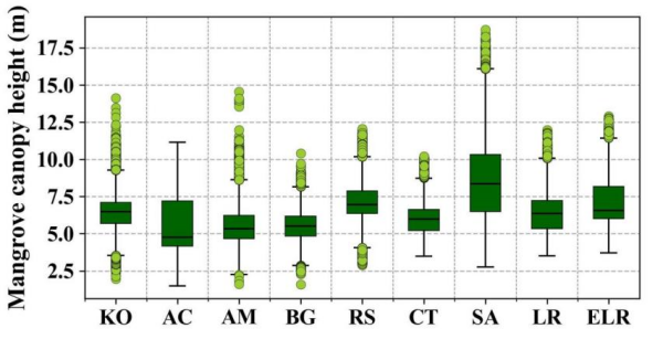 圖2中國主要紅樹樹種冠層高度箱線圖