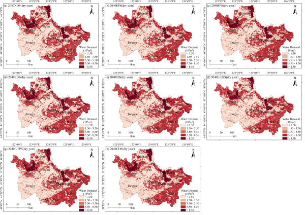 中國科學院東北地理與農業生態研究所科研人員選取了位于東北蘇打鹽堿集中分布區的吉林省西部,通過Plus模型設計了8種不同發展情景以探索符合吉林省西部未來土地利用規劃,并結合水文模型與作物系數法,在考慮枯水年和平水年的情況下,系統對比分析了2040年鹽堿地開發情景與其他7種發展情景下農業水資源供需的變化。研究結果表明:(1)通過有效的土地整治和改良措施,吉林省西部的鹽堿地問題有望得到顯著改善。特別是在鹽堿地改良情景和綜合發展情景中,到2040年鹽堿地面積將分別減少1188 km2和1709 km2(圖1、圖2)。(2)在傳統灌溉模式下,未來農業水資源供應(31.89×108~36.95×108m3)(圖3、圖4)無法滿足農業水資源需求(44.6×108~87.28×108m3)(圖5、圖6),枯水年份缺水的矛盾尤為突出。(3)農業水資源供需不平衡最嚴重的區域主要集中在水稻種植區(圖7)。高耗水作物種植面積的擴大將進一步加劇灌溉用水的壓力。在土地利用和降水變化的共同作用下,水資源供給的復雜性進一步加劇。本研究提出構建深度耦合的氣候-土地-水文模型,以應對未來氣候變化下農業水資源的挑戰,并通過構建“節水灌溉-種植結構優化-供水工程保障”治理模式,實現水資源高效利用和鹽堿地可持續開發的協同目標。研究可為吉林省“大水網工程”建設提供理論和技術支撐。