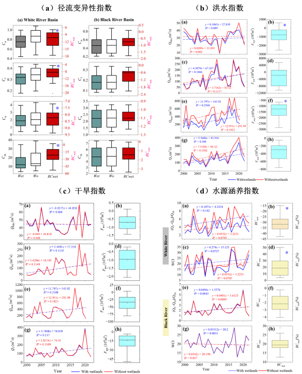 近日,東北地理研究所水文與水資源學科組科研人員聯合西南林業大學和加拿大國立科學研究院提出了流域濕地水文多功能性定量評估框架,利用耦合濕地模塊(包括河濱濕地和孤立濕地模塊)和寒區水文過程(凍土凍融、積雪融化)的半分布式水文模型平臺(PHYSITEL/HYDROTEL),動態模擬流域水文過程,引入徑流變異性、洪水強度、干旱強度和水資源涵養能力等水文指標構建了濕地水文多功能性定量評估體系,并以青藏高原黃河源區的黑河與白河流域為研究區,量化評估了流域濕地水文多功能性。結果顯示,濕地通過減少不均勻分布系數、完全調整系數、集中度和變化幅度來降低徑流變異性。濕地可以有效緩解洪水風險,降低峰值流量,同時提高枯季低流量和基流量。此外,濕地還增強了流域的水資源儲存與涵養能力,對黑河和白河流域蓄水能力的提升作用分別達到30.6%和19.8%。濕地水文多功能性顯著提升了黑河和白河流域應對水文極端事件的韌性(圖2)。