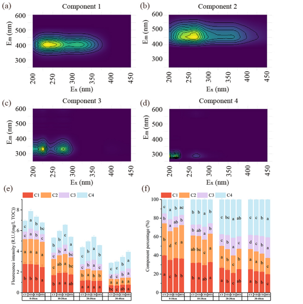 圖2. 不同秸稈還田處理下溶解性有機質的熒光特征變化,基于三維熒光耦合平行因子分析(EEM-PARAFAC)識別到的四種共有熒光組分(a-d)及各組分的相對含量(e)和占比(f)