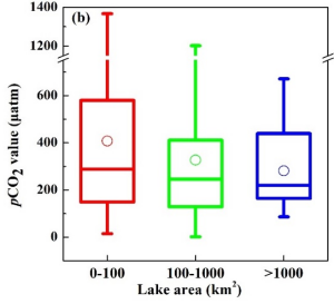 針對上述問題,中國科學院東北地理與農業生態研究所水環境遙感學科組的研究人員,對中國富營養化湖泊進行了二氧化碳分壓(pCO2)調查,率先估算了中國富營養化湖泊年CO2通量估計值為-0.7——1.0 Tg C,且日間pCO2波動主要由表層水體的光合作用活動變化所決定。研究結果表明,富營養化湖泊的pCO2均值變化與氣候區降水量變化規律一致,趨勢為半干旱 > 半濕潤 > 濕潤地區,并且都低于大氣的水平。與此同時,湖泊pCO2均值隨著湖泊平均深度的降低和湖面積的增大而下降(圖1)。本研究拓展了研究人員對溫帶湖泊碳循環的理解,并有助于減少未來湖泊碳預算估算中的不確定性。