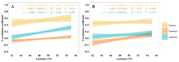 圖1 不同季節濕地植被LAI與晝夜地表溫度的相關系數隨緯度變化圖