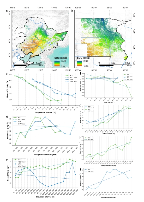 土壤有機碳(Soil Organic Carbon,SOC)在全球碳循環中發揮著關鍵作用,是全球最大的陸地有機碳庫。然而,關于中國東北黑土區(NEC)和北美密西西比河流域黑土區(MNA)SOC含量的空間分布格局及其與環境因子(氣候、地形等)的關系仍不清晰,制約了跨區域碳管理與精準保護的科學支撐。