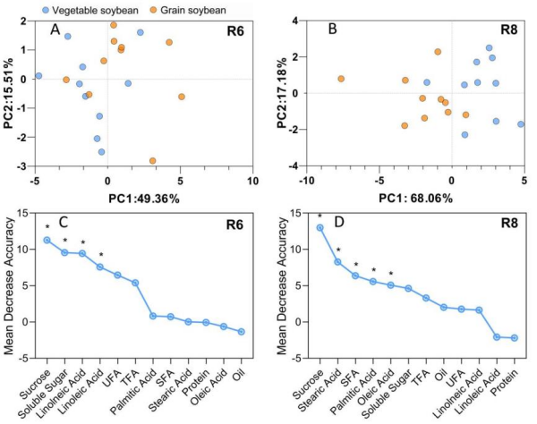 本研究選取了10個鮮食大豆和10個粒用大豆品種(系),對其營養(yǎng)成分進行了全面比較。研究發(fā)現(xiàn),鮮食大豆在蔗糖、可溶性糖和粗蛋白含量上顯著高于粒用大豆,而在粗脂肪和總脂肪酸含量上則相對較低。在鮮莢階段,鮮食大豆含有較高比例的不飽和脂肪酸,尤其是油酸。通過主成分分析(PCA)和機器學習算法,發(fā)現(xiàn)鮮食大豆和粒用大豆在營養(yǎng)組成上存在明顯差異,并且蔗糖是區(qū)分鮮食大豆和粒用大豆的最關鍵營養(yǎng)標志物(圖1)。