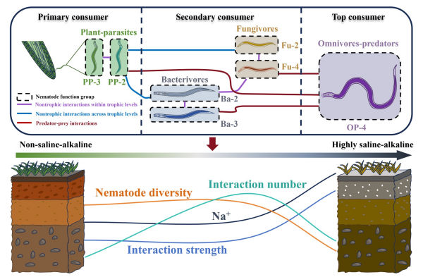 研究團隊沿鹽堿梯度設置了非鹽堿化、弱鹽堿化、中度鹽堿化和高度鹽堿化四個等級的土壤樣點。通過將線蟲按取食行為和生活史策略劃分為不同功能群,并根據各功能群所處生態位進一步將功能群間的相互作用劃分為三類:營養級內非營養相互作用、跨營養級非營養相互作用以及捕食者-被捕食者相互作用,系統構建了線蟲功能群網絡。