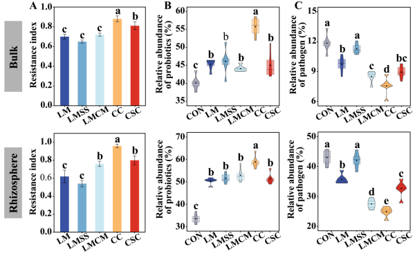 基于海倫水土保持監(jiān)測(cè)研究站的田間定位試驗(yàn)平臺(tái),設(shè)置了對(duì)照(CON)、石灰(LM)、石灰秸稈配施(LMSS)、石灰牛糞配施(LMCM)、2%粗甲殼素(CC)及硅鈣鉀鎂肥(CSC)6種改良處理,系統(tǒng)評(píng)估了其對(duì)土壤性質(zhì)、微生物群落、大豆根腐病發(fā)病率及產(chǎn)量的影響。結(jié)果顯示,改良劑能有效降低大豆根腐病發(fā)病率和提高大豆產(chǎn)量,其中CC抑病和增產(chǎn)效果最大,根腐病發(fā)病率降低70%,產(chǎn)量提高30%以上。土壤改良劑顯著富集了具有抑病和促生功能的潛在有益物種,如Pantoea、Bacillus、Humicola、 Tausonia和Mortierella,同時(shí)減少了潛在病原菌(圖1)。體外共培養(yǎng)實(shí)驗(yàn)進(jìn)一步驗(yàn)證,改良土壤的根際細(xì)菌懸液明顯抑制了病原菌菌絲的生長(zhǎng),且該抑病能力與富集的有益菌豐度呈顯著正相關(guān)(圖2)。土壤改良劑,特別是CC處理誘導(dǎo)了最高的微生物抗性,證實(shí)改良劑能夠通過(guò)誘導(dǎo)健康的微生物區(qū)系來(lái)緩解連作障礙(圖3)。本研究明確了“改良劑-微生物抗性-病害抑制-產(chǎn)量提升”的級(jí)聯(lián)調(diào)控路徑,為維持土壤健康和促進(jìn)作物生產(chǎn)提供了理論依據(jù)。