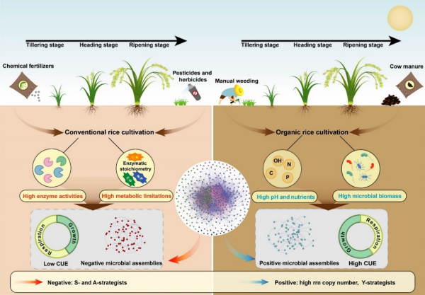 有機農業(yè)作為一種環(huán)境友好型農業(yè)管理方式,在提升土壤健康和促進可持續(xù)農業(yè)發(fā)展方面受到廣泛關注。然而,有機種植如何通過調控土壤微生物群落提升碳利用效率(CUE),進而增強土壤碳匯功能,其機制尚不清晰。近日,中國科學院東北地理與農業(yè)生態(tài)研究所農田分子生態(tài)學科組在東北黑土區(qū)系統(tǒng)比較了長期有機與常規(guī)兩種水稻栽培模式下,土壤微生物CUE在水稻生育期內的動態(tài)變化,并結合土壤理化性質、微生物群落結構、酶活性及生態(tài)化學計量學特征,深入解析了微生物CUE驅動土壤有機碳動態(tài)的特征與機制。