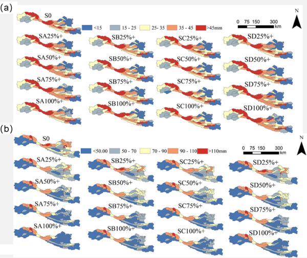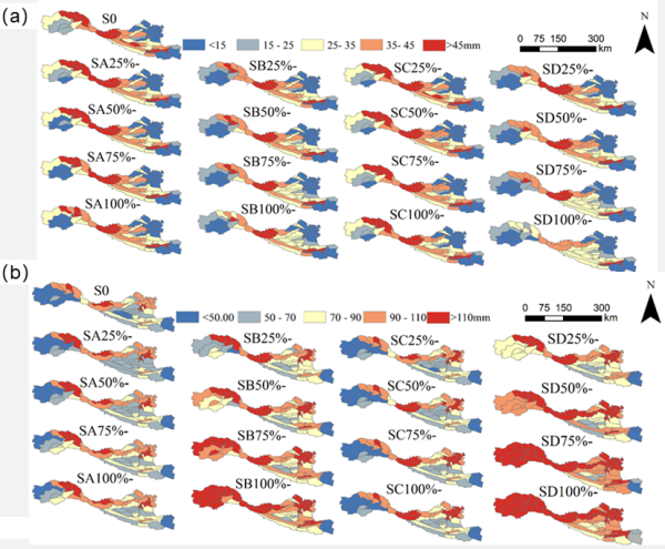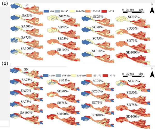 圖 2. 流域生態(tài)系統(tǒng)退化情境下水文服務功能變化。(a)、(b)、(c)、(d)分別表示基準情景(S0)和不同生態(tài)系統(tǒng)退化情景(SA?、SB?、SC?、SD?)下各子流域的單位面積水源涵養(yǎng)量、單位面積產(chǎn)水量、洪水發(fā)生月數(shù)以及干旱發(fā)生月數(shù)。SA、SB、SC 和 SD 分別代表森林、草地、濕地和綜合生態(tài)系統(tǒng)格局的變化;25%?、50%?、75%?和 100%?分別表示生態(tài)系統(tǒng)面積減少 25%、50%、75% 和 100%。SA25%?表示 25% 的森林退化。