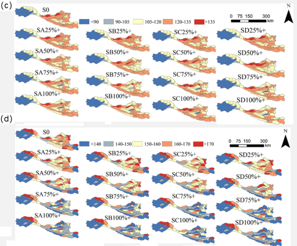 圖 3.流域生態(tài)系統(tǒng)恢復情境下水文服務功能變化(a)、(b)、(c)、(d)分別表示基準情景(S0)和不同生態(tài)系統(tǒng)保護情景(SA+、SB+、SC+、SD+)下各子流域的單位面積水源涵養(yǎng)量、單位面積產(chǎn)水量、洪水發(fā)生月數(shù)以及干旱發(fā)生月數(shù)。SA、SB、SC 和 SD 分別代表森林、草地、濕地以及綜合生態(tài)系統(tǒng);25%+、50%+、75%+ 和 100%+ 分別表示 25%、50%、75% 和 100% 的裸地轉(zhuǎn)化比例。SA25%+ 表示將 25% 的裸地轉(zhuǎn)化為森林。