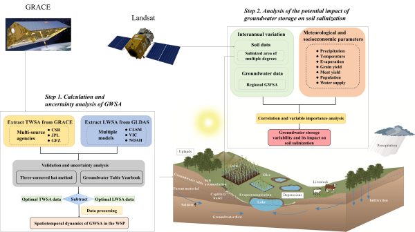 東北地理所濕地生態(tài)工程學(xué)科組和微波遙感學(xué)科組研究人員以吉林西部典型半干旱農(nóng)業(yè)平原為研究區(qū),綜合利用GRACE/GRACE-FO數(shù)據(jù)與多源遙感數(shù)據(jù)、GLDAS水文模型數(shù)據(jù)以及地面地下水和土壤觀測數(shù)據(jù),系統(tǒng)刻畫了地下水儲(chǔ)量和動(dòng)態(tài)的時(shí)空變化格局,并結(jié)合高精度空間統(tǒng)計(jì)模型與地理加權(quán)回歸分析,從區(qū)域尺度和剖面尺度定量解析地下水動(dòng)態(tài)、地形條件、植被覆蓋及氣候因子等因素對(duì)土壤鹽漬化空間分異的多尺度驅(qū)動(dòng)機(jī)制。