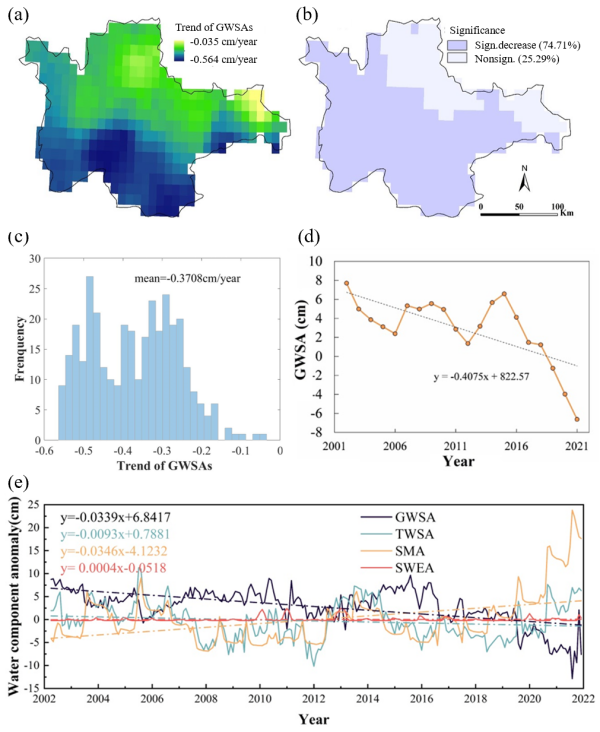 圖2 2002年至2021年吉林西部地區(qū)地下水儲(chǔ)量異常時(shí)空變化 (a)2002-2021年吉林西部地區(qū)地下水儲(chǔ)量異常(GWSA)的空間趨勢;(b)空間趨勢的顯著性;(c)空間趨勢頻率直方圖;(d)GWSA的時(shí)間趨勢;(e)GWSA、陸地水儲(chǔ)量異常(TWSA)、土壤水異常(SMA)和雪水當(dāng)量異常(SWEA)的時(shí)間序列變化。