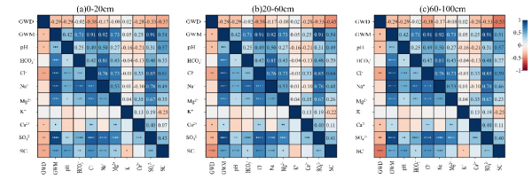 圖3 各層土壤鹽分與地下水參數(shù)相關(guān)系數(shù)圖 *p<0.05;**p<0.01;***p<0.001