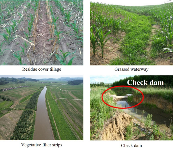 圖1 研究區(qū)BMPs應(yīng)用情況。Residue cover tillage:秸稈覆蓋耕作;Grassed waterway:植草溝渠;Vegetative filter strips:植被過濾帶;Check dem:谷坊