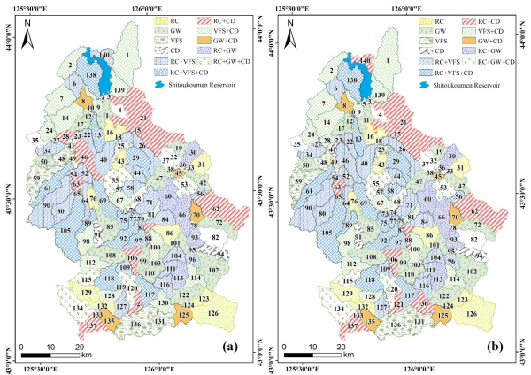 針對上述問題,中國科學(xué)院東北地理與農(nóng)業(yè)生態(tài)研究所水環(huán)境污染與防治學(xué)科組以長春市重要飲用水源地—石頭口門水庫上游流域為研究對象,綜合運(yùn)用土壤與水評估工具(SWAT)模型與非支配排序遺傳算法II(NSGA-II),開展了流域尺度上面源污染控制措施的多目標(biāo)優(yōu)化研究。研究評估了四種典型BMPs:秸稈覆蓋耕作(RC)、植草水道(GW)、植被過濾帶(VFS)和谷坊(CD)在不同組合情景下的污染負(fù)荷削減效能,并首次將實施成本、土地占用與污染削減效率納入統(tǒng)一優(yōu)化框架。
