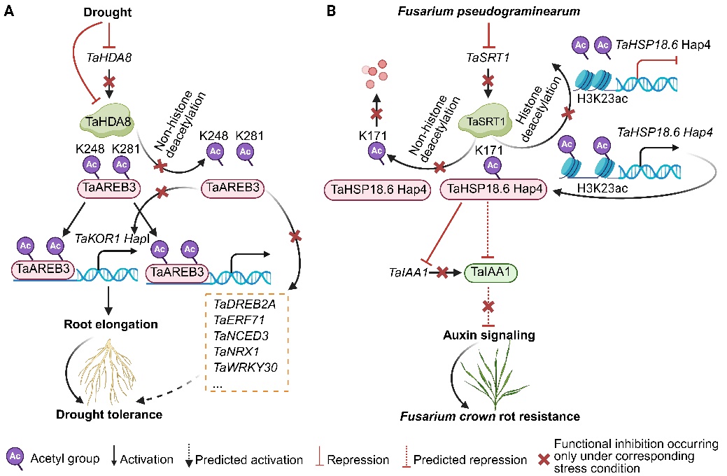 團隊以Nonhistone deacetylation: a switch for crop resilience為題發表于Trends in Plant Science的 Spotlight文章指出,組蛋白去乙酰化酶(HDAC)介導的非組蛋白去乙酰化在作物逆境響應中充當重要的分子開關。在小麥中,組蛋白去乙酰化酶TaHDA8通過去乙酰化轉錄因子TaAREB3抑制根系伸長,從而負調控抗旱性,但干旱脅迫會抑制TaHDA8的蛋白豐度;組蛋白去乙酰化酶TaSRT1通過去乙酰化熱激蛋白TaHSP18.6抑制生長素信號,進而負調控鐮刀菌冠腐病抗性,而病原侵染同樣會降低TaSRT1的蛋白豐度。由此,生物脅迫與非生物脅迫觸發的“去乙酰化作用解除”可作為提升作物抗逆性的調控開關,為抗逆育種提供了可模塊化利用的新靶點。