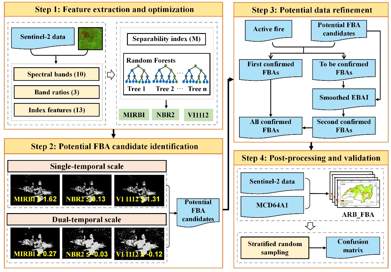 針對上述問題,中國科學院東北地理與農業生態研究所任春穎研究員團隊研發了一套融合活躍火數據與Sentinel-2多時序影像的森林火燒跡地精準檢測方法框架。研究人員通過引入火燒導致的反射率突變及火后短期光譜異常信息,構建了增強型火燒跡地指數(EBAI),顯著提升了火燒區與非火燒區的光譜區分能力?;诖朔椒蚣?,獲得了黑龍江流域2020-2023年空間分辨率10米、逐月森林火燒跡地產品(ARB_FBA),其錯分誤差介于7.65%—8.46%之間,漏分誤差為9.43%—13.02%,Dice系數高達89.94%—91.21%。分析結果表明,黑龍江流域春季(3-5月)為森林火災高發期,2023年火燒跡地面積激增,這一現象與當年破紀錄的熱浪及森林管理疏漏密切相關。