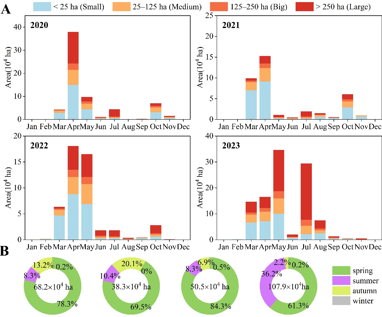 圖2 2020—2023 年黑龍江流域森林火燒跡地面積變化特征。(A) 不同燃燒斑塊的月度變化特征;(B) 火燒跡地面積的季節分布特征。