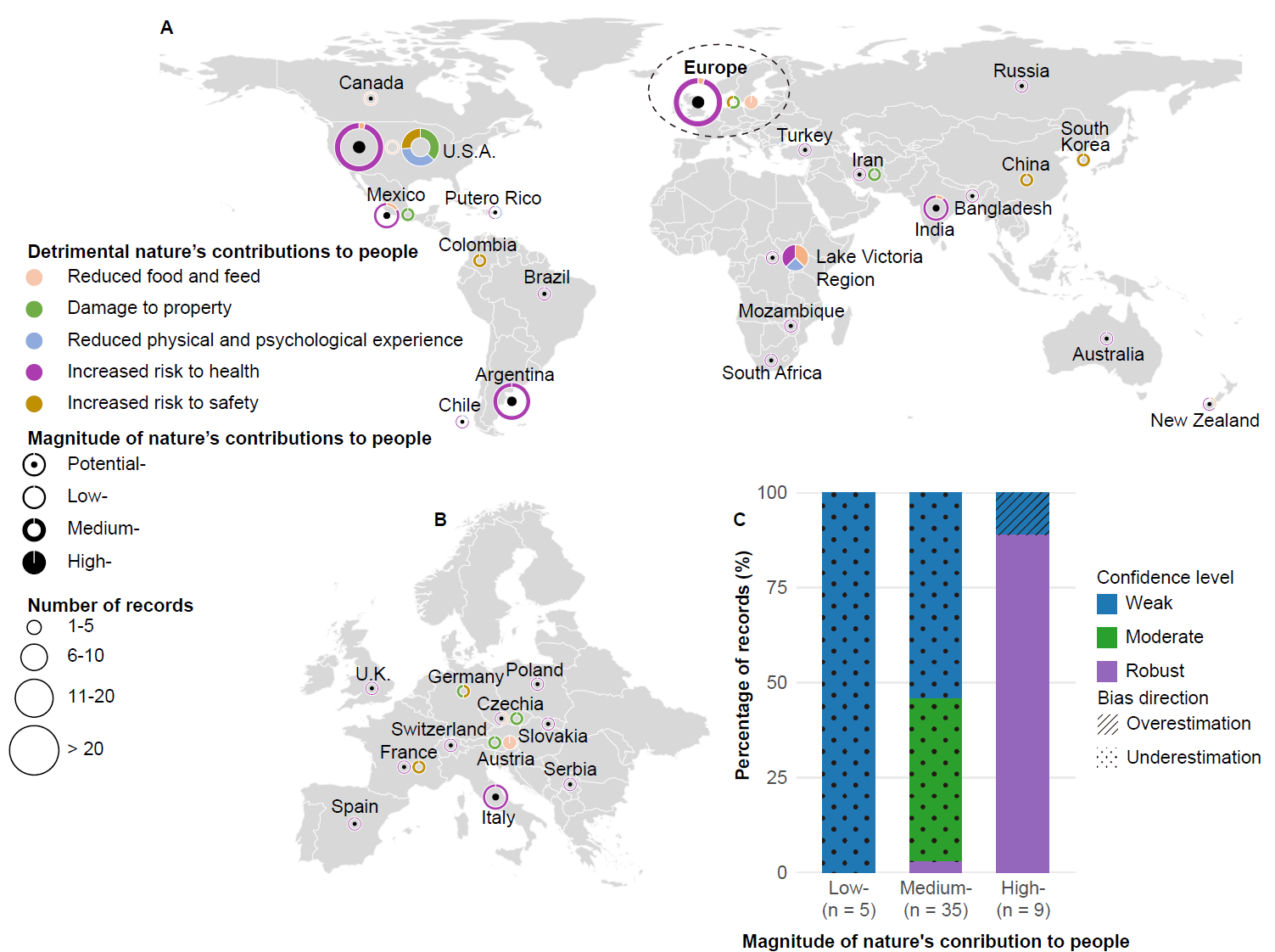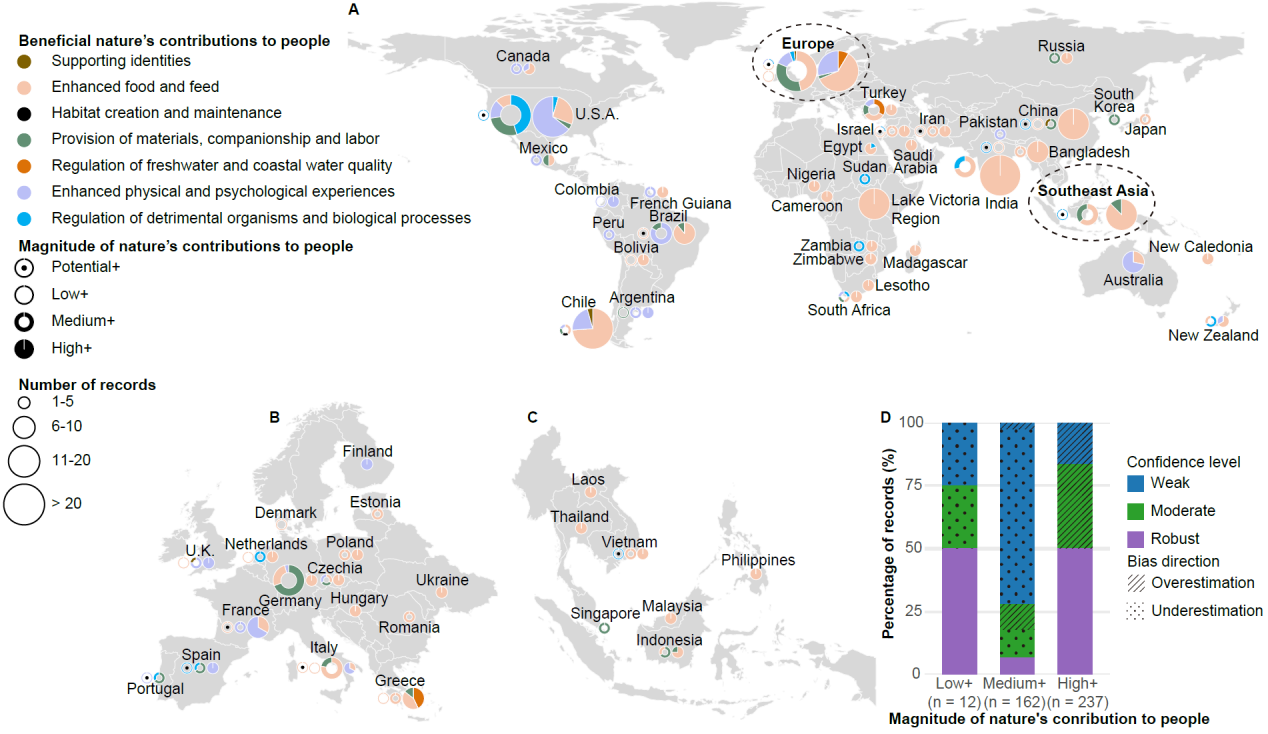 該研究基于“自然對(duì)人類貢獻(xiàn)(Nature’s Contributions to People)”框架開(kāi)發(fā)了一套半定量評(píng)估方法,系統(tǒng)性評(píng)估了全球外來(lái)淡水大型動(dòng)物對(duì)人類社會(huì)產(chǎn)生的正面與負(fù)面影響。研究結(jié)果表明,已有 93種外來(lái)淡水大型動(dòng)物(占現(xiàn)存物種的43%)被引入到其本土分布區(qū)之外,涵蓋了魚類、哺乳類、爬行類和兩棲類。該研究共識(shí)別了429項(xiàng)正面社會(huì)經(jīng)濟(jì)效應(yīng)記錄(圖1),包括提升食物供給(57%)、促進(jìn)休閑漁業(yè)和生態(tài)旅游(20%)以及提供生產(chǎn)和貿(mào)易所需的原材料供給(12%)等。一些淡水大型動(dòng)物如鯉魚(Cyprinus carpio)、草魚(Ctenopharyngodon idella)和尖齒胡鯰?(Clarias gariepinus)等在全球多地被引入后已成為當(dāng)?shù)鼐用裰匾氖澄飦?lái)源和漁業(yè)資源,而尼羅鱷(Crocodylus niloticus)和暹羅鱷等(Crocodylus siamensis)則常被引入到本土分布區(qū)之外用于發(fā)展養(yǎng)殖業(yè)和寵物貿(mào)易。研究還發(fā)現(xiàn),亞洲和非洲引入外來(lái)淡水大型動(dòng)物的主要?jiǎng)訖C(jī)是增強(qiáng)食物供給,而在北美則主要與休閑漁業(yè)和寵物貿(mào)易相關(guān)。