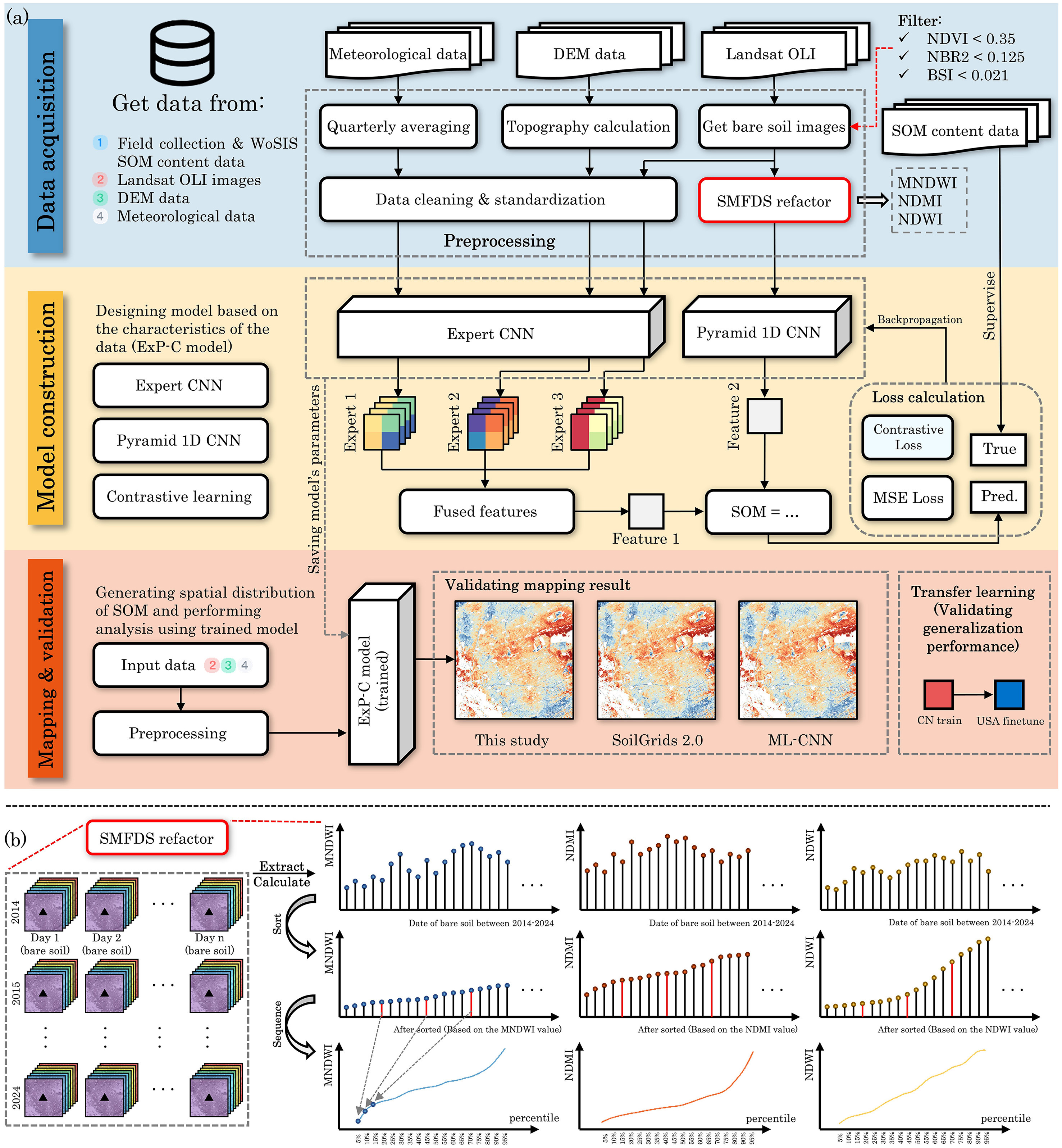 針對上述局限性,中國科學院東北地理與農業生態研究所農業遙感學科組以中美兩大典型黑土區(中國東北和美國密西西比河流域)的耕地為研究對象,創新性地提出了一種融合土壤水分動態反饋序列(SMDFS)的新型時空深度學習框架(ExP-C)。研究團隊收集了2014-2024年間的2616個表層(0-20厘米)土壤實測樣本,并深度融合了Landsat-8裸土合成影像、SRTM地形變量以及ERA5氣象等多源數據。研究通過對多時相水分相關光譜指數(MNDWI、NDWI、NDMI)進行百分位重構生成了SMDFS,從而精準捕捉了不同SOM水平與土壤水分保持能力之間的動態反饋特征。在此基礎上構建的ExP-C模型,融合了用于提取靜態協變量空間上下文特征的“專家卷積網絡”,以及用于挖掘多尺度SMDFS時間序列模式的“金字塔1D卷積網絡”,并結合對比學習策略進一步增強了模型的特征表示能力。