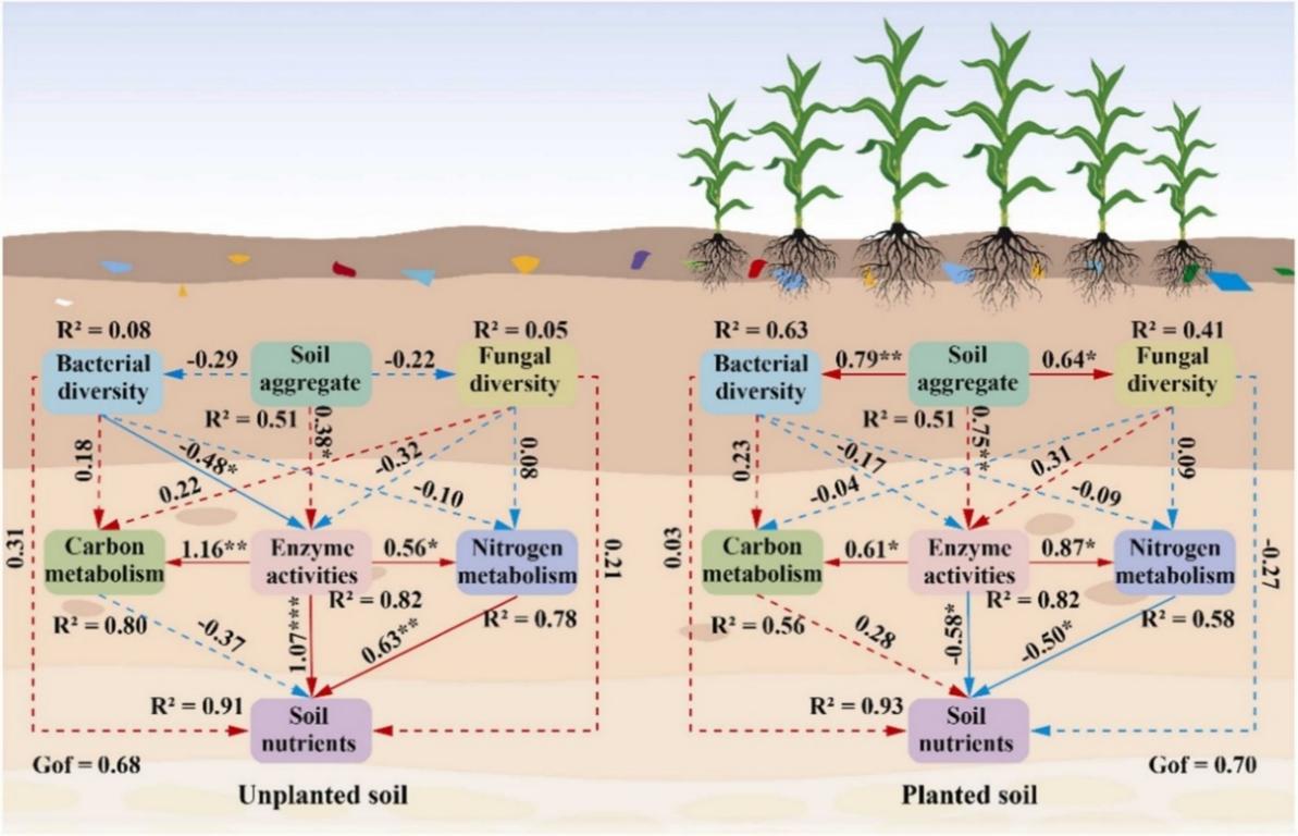 此外,研究人員比較了有無玉米種植條件下可降解聚乳酸微塑料(PLA MPs)對農田土壤生態過程的擾動效應。結果發現,PLA MPs顯著影響土壤碳氮養分供給格局、土壤團聚體組成及微生物功能過程,但其生態效應在不同種植條件下表現出明顯差異。在無植物條件下,PLA MPs整體上促進了土壤微生物碳氮代謝;而在玉米種植條件下,這種促進效應明顯減弱,部分指標甚至呈現相反變化。進一步分析表明,作物根際過程以及植物與微生物之間的養分競爭,是調控PLA MPs生態效應的重要機制。