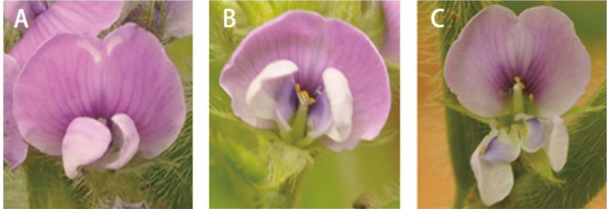 A.正常大豆花,B.TCP2基因異位表達,C.TCP3基因異位表達