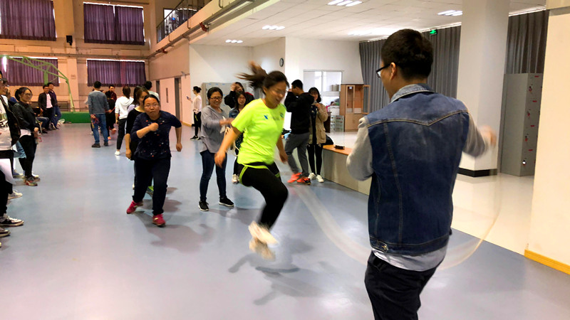本次比賽包括團體跳繩和拔河兩個項目,以班級為單位分為四支代表隊參賽。在首先進行的團體跳繩比賽中,伴隨著繩起繩落,選手們次序井然、你來我往,輕盈敏捷的身手不時博得場外觀眾的陣陣掌聲。最終,2016級博士代表隊技高一籌,獲得了團體跳繩比賽的第一名。