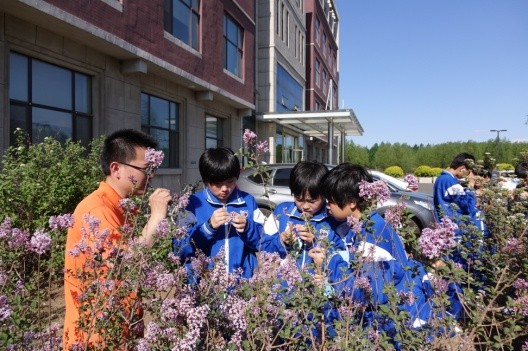在濕地標(biāo)本館,劉波博士為同學(xué)們講解了如何收集、制作和保存植物標(biāo)本,并做了題為“花的世界”的主題科普?qǐng)?bào)告。劉波博士帶領(lǐng)同學(xué)們?cè)谒鶅?nèi)園區(qū)進(jìn)行野外植物的觀察活動(dòng),他以忍冬,紅瑞木和丁香為例,通過(guò)學(xué)生親手解剖朵花,觀察花的結(jié)構(gòu)和類(lèi)型,以小組活動(dòng)的形式,辨認(rèn)花冠的類(lèi)型,兩性花和單性花。同學(xué)們?cè)谟H自實(shí)踐中,發(fā)現(xiàn)問(wèn)題,學(xué)習(xí)知識(shí),現(xiàn)場(chǎng)氣氛十分活躍。