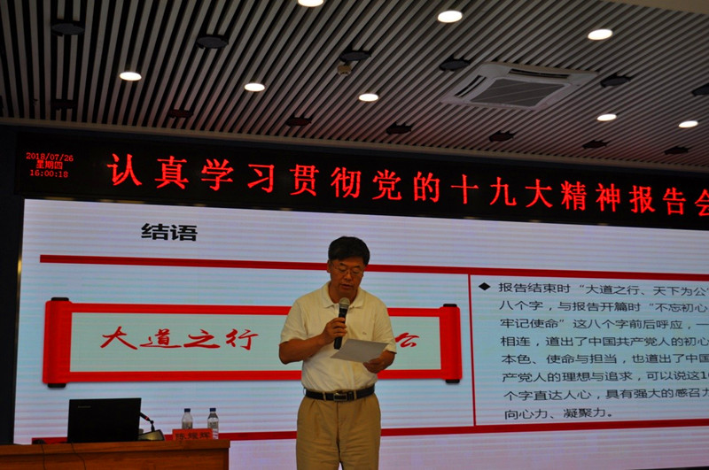 陳耀輝以《不忘初心 牢記使命 奪取新時代中國特色社會主義偉大勝利——認真學習貫徹黨的十九大精神》為題,緊緊圍繞黨的十九大主題和發展成果、習近平新時代中國特色社會主義思想、過去五年的歷史性成就和歷史性變革、中國特色社會主義進入新時代、我國社會主要矛盾的變化、兩個一百年奮斗目標的戰略部署、堅定新時代的文化自信、全面從嚴治黨等八個大的方面,對黨的十九大精神進行了詳細解讀,報告內容翔實,案例豐富,與實際生活聯系緊密,深刻闡釋了黨的十九大提出的一系列重要思想、重要觀點、重大論斷、重大舉措。報告站位高、解讀透、信息量大、系統深入,圍繞十九大精神“不忘初心、牢記使命”這一主題,生動闡述了中國共產黨在長期奮斗中形成的“為中國人民謀幸福,為中華民族謀復興”的初心和使命,對全所深入學習貫徹十九大精神,推動科技創新工作必將產生積極的促進作用。