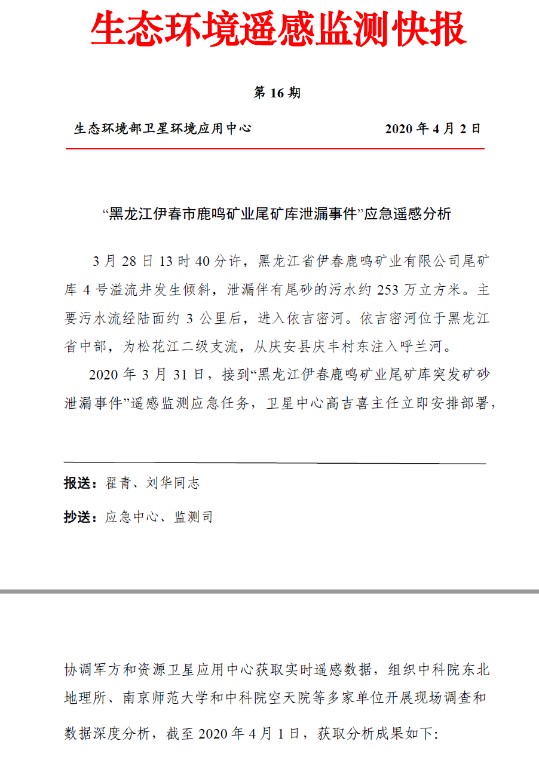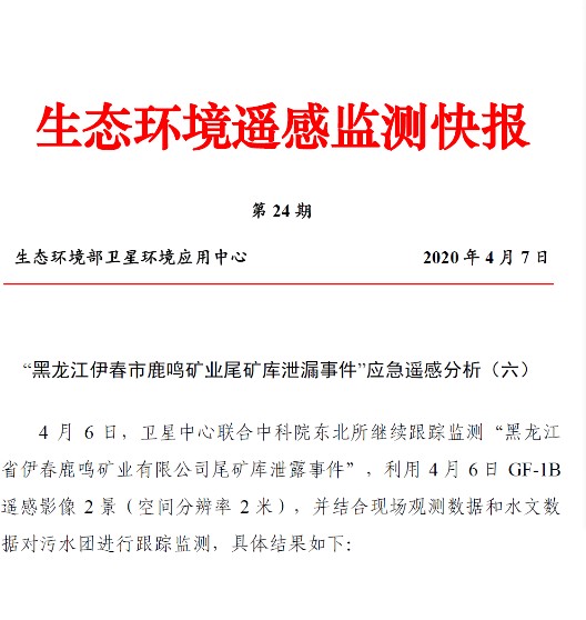 2020年3月28日,黑龍江省伊春市鹿鳴礦業(yè)有限公司鉬礦尾礦庫4號溢流井發(fā)生傾斜,泄漏伴有尾砂的污水約253萬立方米,污水流出約3公里后進(jìn)入依吉密河。黑龍江省委、省政府立即啟動Ⅱ級應(yīng)急響應(yīng)并成立應(yīng)急搶險(xiǎn)指揮部,生態(tài)環(huán)保部應(yīng)急指導(dǎo)組副部長翟青等帶領(lǐng)專家組趕赴現(xiàn)場指導(dǎo)應(yīng)急處置工作,迅速聯(lián)合制定了“堵水源、截水頭”的具體處置方案。按照專家組意見,在“泄漏水頭”設(shè)置10道攔截壩,減緩降低尾礦漿水下泄速度和濃度,采取投放絮凝劑、活性炭的方式,對污染物進(jìn)行吸附和絮凝沉淀,防止污染物向下游遷移。截至目前,泄漏點(diǎn)已完成封堵,事件取得階段性重要進(jìn)展,依吉密河下游污染物濃度大幅下降,上游河段已經(jīng)開始啟動清淤工作;隨著污水團(tuán)向下游遷移,呼蘭河中的污染峰值在逐步衰減。據(jù)應(yīng)急專家分析研判,尾礦壩不存在安全風(fēng)險(xiǎn),下游農(nóng)田環(huán)境風(fēng)險(xiǎn)和飲用水安全風(fēng)險(xiǎn)可控。