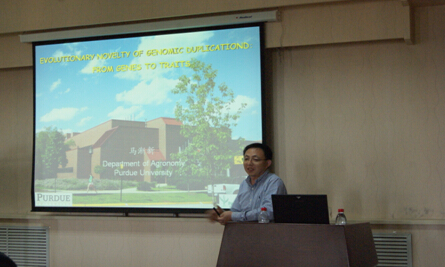 2015年7月3日,“大豆分子設(shè)計(jì)育種”創(chuàng)新團(tuán)隊(duì)國際合作伙伴--美國普渡大學(xué)馬漸新教授來我所做了題為“Evolutionary novelty of genomic duplication:from genes to traits”的精彩學(xué)術(shù)報(bào)告。報(bào)告會(huì)由實(shí)驗(yàn)室副主任孔凡江研究員主持,長春所區(qū)和哈爾濱園區(qū)的相關(guān)科研人員和研究生聽取了報(bào)告。
