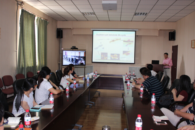2015年6月16日-17日美國明尼蘇達大學(xué)植物病理系陳森玉教授應(yīng)農(nóng)田有害生物控制學(xué)科組王從麗研究員邀請,他訪問黑龍江省農(nóng)業(yè)科學(xué)院齊齊哈爾分院后順訪我所。6月17日上午在哈區(qū)進行學(xué)術(shù)報告,題目為“The Soybean Cyst Nematode Host Resistance and Biological Control Studies”,長春視頻。報告內(nèi)容主要從大豆孢囊線蟲(SCN)的毒性變異對抗性資源的沖擊、抗耐SCN的大豆品系鑒定和培育、玉米大豆輪作系統(tǒng)中SCN抑制性土壤生態(tài)研究、管理措施對線蟲種群、土壤健康、玉米大豆輪作產(chǎn)量的影響、SCN寄生真菌多樣性、遺傳學(xué)和功能研究,科研人員和研究生們積極參加并踴躍發(fā)言。然后參觀了實驗室,王從麗研究員介紹了目前研究內(nèi)容及進展,專家提出了寶貴的建議,并對研究生的研究方案和方法進行了充分的討論。雙方將尋找機會,申請項目資助,派研究生到貴單位學(xué)習(xí)交流合作。