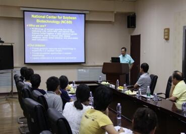 訪問期間Henry T. Nguyen教授介紹了美國密蘇里大豆生物技術(shù)中心的研究領(lǐng)域及成果。他的團(tuán)隊主要從事大豆高產(chǎn)、抗包囊線蟲及抗病性、非生物脅迫和大豆品質(zhì)方面的分子遺傳特性研究,目的是為美國大豆產(chǎn)業(yè)的發(fā)展提供良好基因資源。目前Henry T. Nguyen教授的團(tuán)隊利用分子遺傳技術(shù),育成了可代替橄欖油的高油酸大豆品種,已在生產(chǎn)上應(yīng)用,預(yù)計在未來幾年有望大面積推廣。會議期間Henry T. Nguyen教授對參會師生提出的具體問題進(jìn)行了詳細(xì)的分析與解答。交流會后,倆位專家參觀了我所的實驗室和試驗基地。