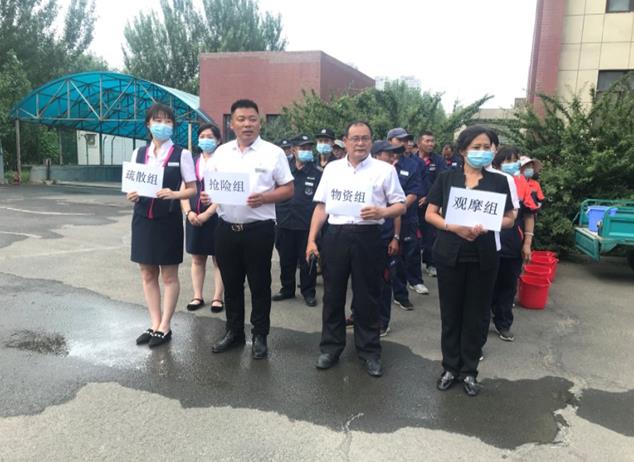 參加演練的人員分按照責任分工劃分為疏散組、搶險組、物資保障組和觀摩組等單元。物資保障組提前準備好了灑水車、防汛沙袋、抽水泵等防汛物資。防汛應急演練開始后,物資保障組利用綠化灑水車模擬了持續下雨天氣下出現汛情的緊急環境,疏散組及時通知處于險情的人員疏散到安全的地方,并開展細致的排查工作。在汛期安全風險最大的地下車庫入口處,搶險組模擬出現雨水倒灌的情況迅速在車庫門口堆放了防洪沙袋,并開動抽水泵現場操作了防汛排澇處置程序?!把辞椤苯Y束后,疏散組通知大家緊急情況解除,保潔人員馬上對現場進行了相關清理工作。