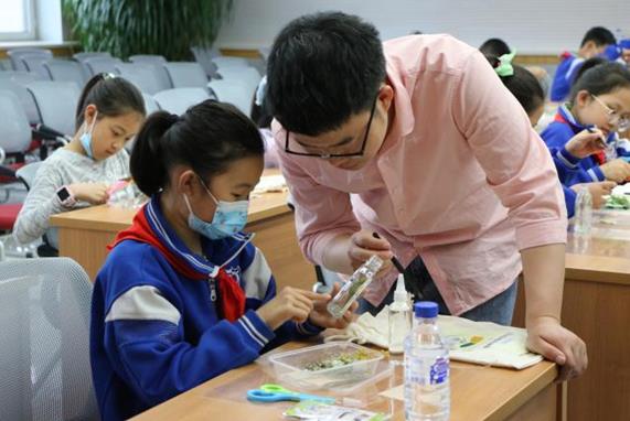 科普報告后,濕地生態與環境重點實驗室張振剛博士帶領同學們動手制作植物浮游瓶。同學們通過標本制作直觀的了解了植物的結構特征,在科普志愿者的分組指導下,認真選取植物葉片和花朵,發揮想象力和創造力,組合成各式各樣的美麗的植物浮游瓶。