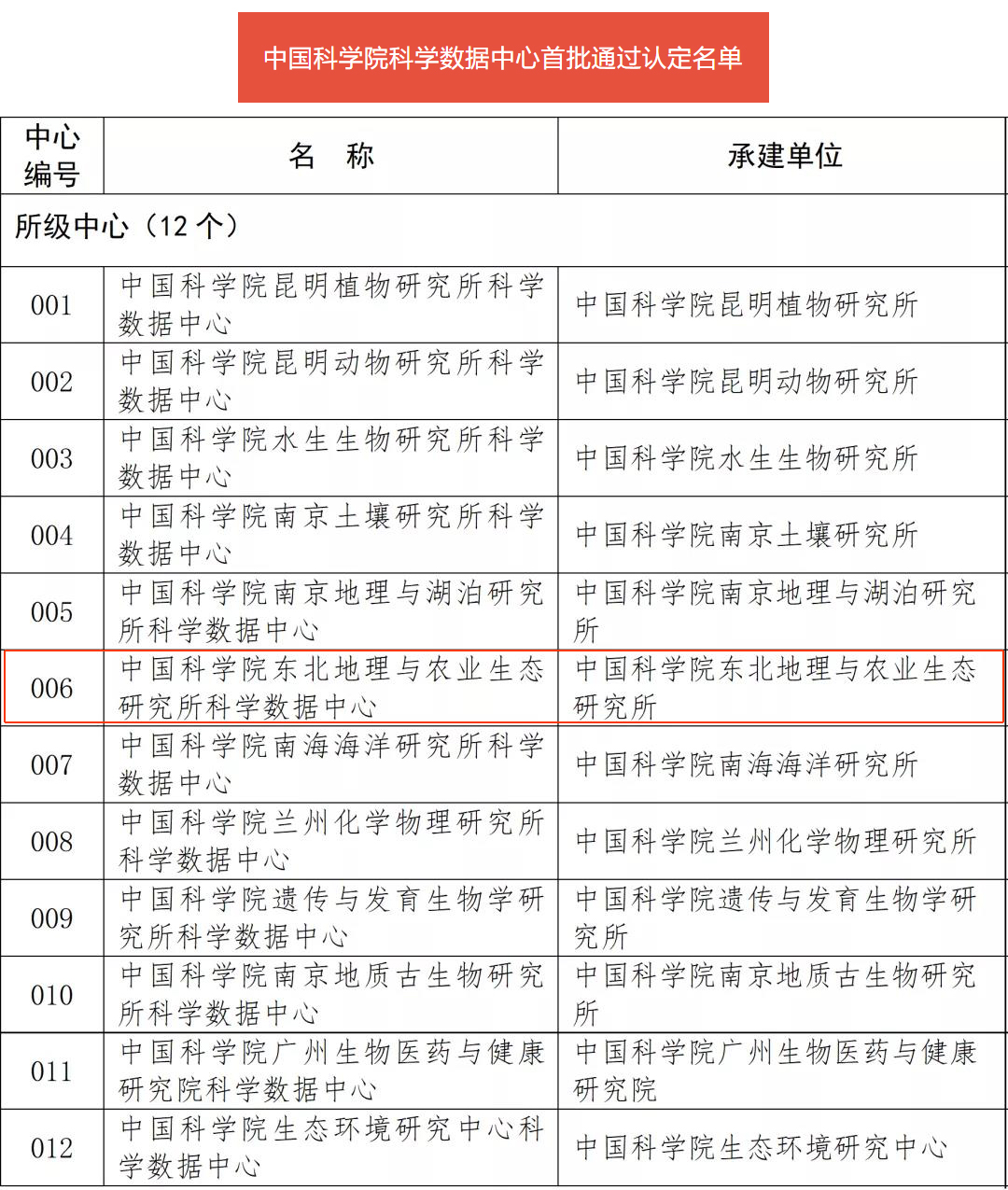東北地理所科學(xué)數(shù)據(jù)中心入選首批通過認(rèn)定的所級(jí)中心。首批通過認(rèn)定的31家院科學(xué)數(shù)據(jù)中心包括1個(gè)總中心、18個(gè)學(xué)科中心、12個(gè)所級(jí)中心。首批通過認(rèn)定的所級(jí)中心有:昆明植物所科學(xué)數(shù)據(jù)中心、昆明動(dòng)物所科學(xué)數(shù)據(jù)中心、水生生物所科學(xué)數(shù)據(jù)中心、南京土壤所科學(xué)數(shù)據(jù)中心、南京地理所科學(xué)數(shù)據(jù)中心、東北地理所科學(xué)數(shù)據(jù)中心、南海海洋所科學(xué)數(shù)據(jù)中心、蘭州化物所科學(xué)數(shù)據(jù)中心、遺傳發(fā)育所科學(xué)數(shù)據(jù)中心、南京地質(zhì)古生物所科學(xué)數(shù)據(jù)中心、廣州健康院科學(xué)數(shù)據(jù)中心、生態(tài)環(huán)境中心科學(xué)數(shù)據(jù)中心。