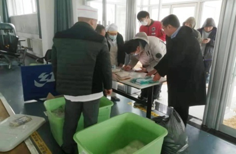 中午時分,用餐微信群里面發(fā)出用餐通知,物業(yè)人員按照統(tǒng)計人數(shù)把飯菜、水果送到研究生宿舍和流動公寓宿舍。姜明和蘇陽關(guān)切地詢問飯菜是否可口、是否熱乎,要求一定要搞好食堂衛(wèi)生和保障食材來源安全,并設(shè)置 “臨時廚房”供簡單加工食材使用。送餐完畢,姜明和蘇陽來到研究所食堂,慰問員工食堂,對工作人員的辛勤付出表示感謝。