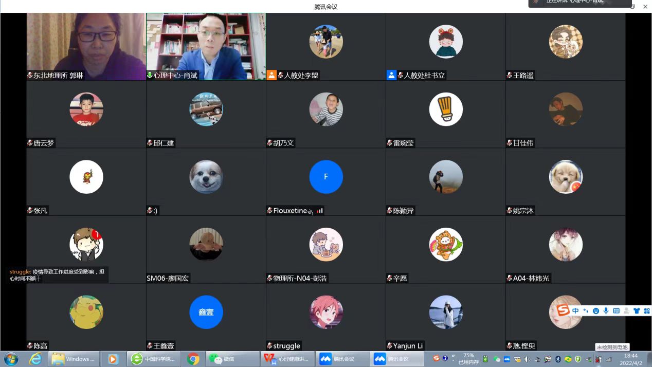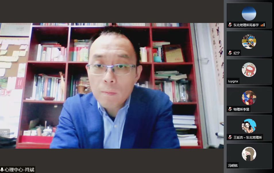 為幫助東北地理所師生在研究所靜態(tài)管理期間調適好心情,保持樂觀積極向上的健康心態(tài),增強心理保健能力,4月2日,東北地理所邀請中國科學院大學心理健康教育中心主任肖斌在線上舉辦了“穩(wěn)定自我,面對挑戰(zhàn)”的心理健康專題交流會。交流會以回答問題交流的形式進行,由人事教育處處長郭琳主持,研究生、導師共計200余人參會。