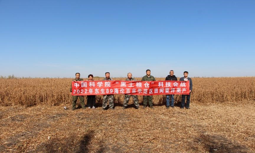 今秋喜報又傳。2022年秋季,來自黑龍江省農業(yè)科學院、綏化市農業(yè)技術推廣中心、雙鴨山市質量技術檢測中心等單位的12位省級專家分成2組測產,專家組分別在黑龍江省海倫市長發(fā)鎮(zhèn)百畝示范田和友誼縣一分場百畝示范田分別對中國科學院“黑土糧倉”科技會戰(zhàn)項目—大豆新品種“東生89”和中國科學院重點部署項目“大豆高產穩(wěn)產分子基礎與品種培育”——大豆新品種“東生201”百畝示范田進行實地測產,專家組嚴格按照理論測產和實際測產結合方法,通過隨機抽樣選點、稱重量、量密度、田間收獲等方式,現場測量,測產結果矮桿耐密品種“東生89”在海倫市示范田畝產256.99公斤,“東生201”在友誼農場百畝示范田畝產270.8公斤,均超額完成創(chuàng)高產的既定目標。