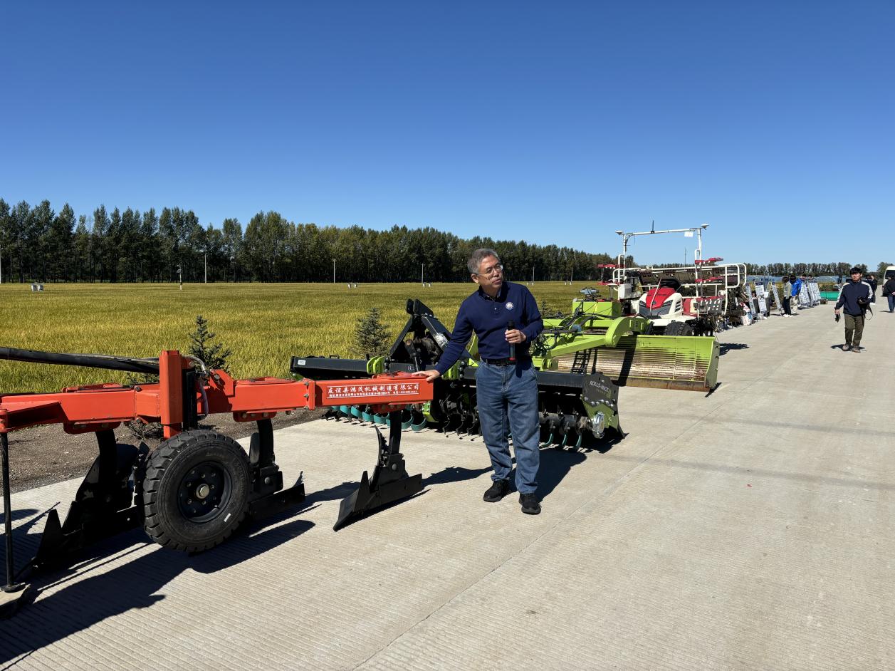 在智慧農場水田,友誼分公司副總經理韓乃坤介紹了三江示范區與農場在科技園區共建方面的工作進展,劉煥軍介紹了中國科學院北大荒友誼現代農業實驗站一站多點式的建設情況。模式三負責人王洋研究員及其骨干成員介紹了水田的技術集成、寒地水田保護性耕作技術等;模式一負責人郭躍東研究員及其骨干成員介紹了水土資源優化配置技術、地下水監測預警技術以及節水灌溉技術。此外,示范區還對寬窄行插秧機、平地機、秸稈腐解劑、節水灌溉溝渠以及凈化生物等進行了實物展示。