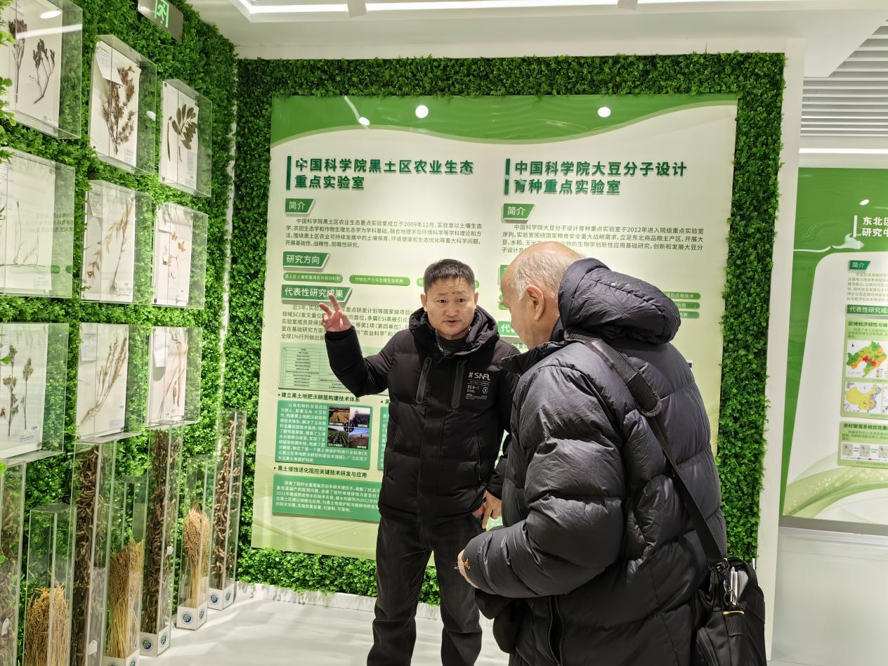 報告會后,在黃迎新研究員的陪同下,Cory Matthew教授參觀了黑土糧倉科技會戰(zhàn)指揮中心宣傳展示平臺,黃迎新研究員詳細介紹了黑土糧倉科技會戰(zhàn)實施以來,取得的重要成果和技術突破。