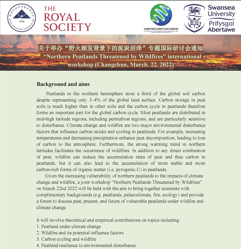 關于舉辦“野火頻發背景下的泥炭沼澤”專題國際研討會通知“Northern Peatlands Threatened by Wildfires” international workshop (Changchun, March. 22, 2022)