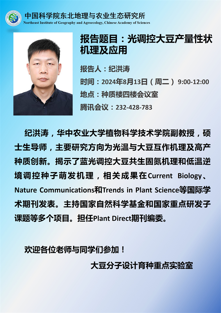 光調控大豆產量性狀機理及應用-紀洪濤 副教授